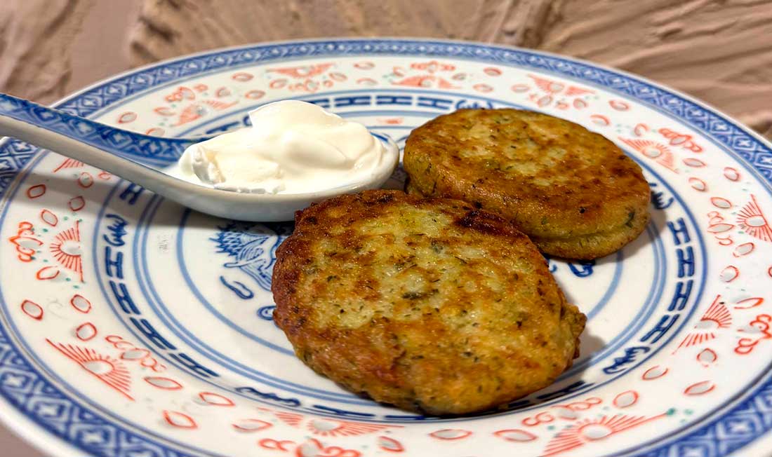 Ρrispy zucchini hashbrowns served with Greek yogurt